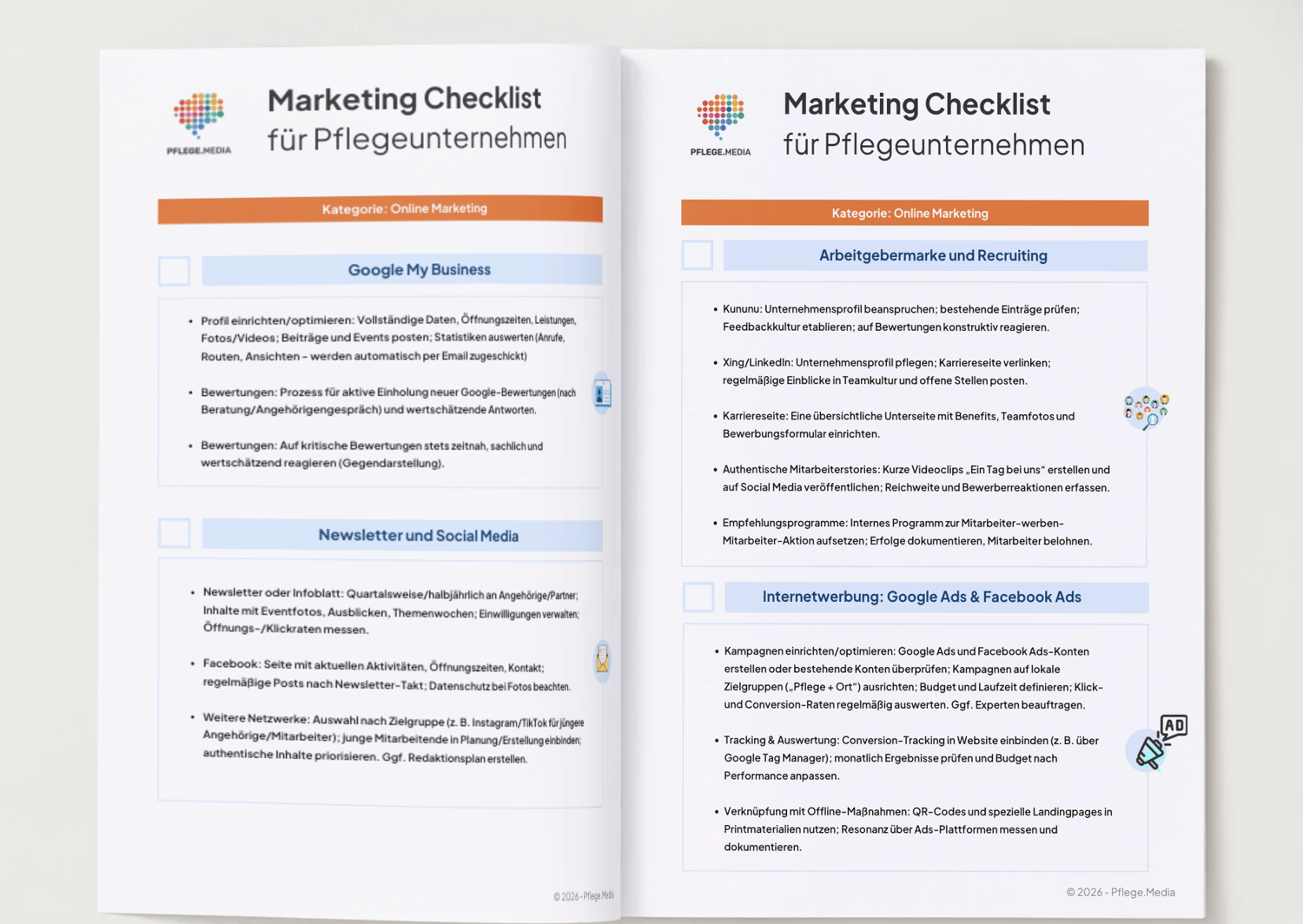 Diese umfassende „Pflege Media Marketing Checkliste“ wurde speziell für Pflegeeinrichtungen entwickelt und hilft Ihnen, sichtbarer zu werden, neue Gäste und Mitarbeitende zu gewinnen und Ihre Marke nachhaltig zu stärken.